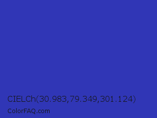 CIELCh 30.983,79.349,301.124 Color is a normal blue color and the nearest color is Governor Bay #2f3cb3. Hex code #3036b6 and RGB value is rgb(48,54,182). In RGB color space, this color is composed of 19% red, 21% green, 71% blue, In CMYK color space, this color is composed of 74% cyan, 70% magenta, 0% yellow , 29% black , In HSL color space, this color has a hue angle of 237° , 58% saturation and 45% lightness.