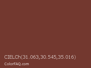 CIELCh 31.063,30.545,35.016 Color is a normal red color and the nearest color is Wine #722f37. Hex code #73382f and RGB value is rgb(115,56,47). In RGB color space, this color is composed of 45% red, 22% green, 18% blue, In CMYK color space, this color is composed of 0% cyan, 51% magenta, 59% yellow , 55% black , In HSL color space, this color has a hue angle of 8° , 42% saturation and 32% lightness.
