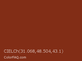 CIELCh 31.068,48.504,43.1 Color is a dark red color and the nearest color is Pueblo #7d2c14. Hex code #822d16 and RGB value is rgb(130,45,22). In RGB color space, this color is composed of 51% red, 18% green, 9% blue, In CMYK color space, this color is composed of 0% cyan, 65% magenta, 83% yellow , 49% black , In HSL color space, this color has a hue angle of 13° , 71% saturation and 30% lightness.