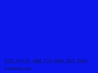 CIELCh 31.088,120.868,305.349 Color is a normal blue color and the nearest color is Bluebonnet #1c1cf0. Hex code #0c17eb and RGB value is rgb(12,23,235). In RGB color space, this color is composed of 5% red, 9% green, 92% blue, In CMYK color space, this color is composed of 95% cyan, 90% magenta, 0% yellow , 8% black , In HSL color space, this color has a hue angle of 237° , 90% saturation and 48% lightness.
