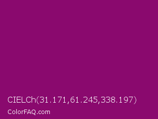 CIELCh 31.171,61.245,338.197 Color is a dark magenta color and the nearest color is Cardinal Pink #8c055e. Hex code #8a096e and RGB value is rgb(138,9,110). In RGB color space, this color is composed of 54% red, 4% green, 43% blue, In CMYK color space, this color is composed of 0% cyan, 93% magenta, 20% yellow , 46% black , In HSL color space, this color has a hue angle of 313° , 88% saturation and 29% lightness.