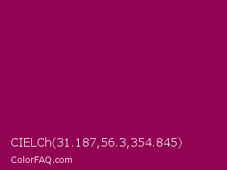 CIELCh 31.187,56.3,354.845 Color is a dark magenta color and the nearest color is Cardinal Pink #8c055e. Hex code #910453 and RGB value is rgb(145,4,83). In RGB color space, this color is composed of 57% red, 2% green, 33% blue, In CMYK color space, this color is composed of 0% cyan, 97% magenta, 43% yellow , 43% black , In HSL color space, this color has a hue angle of 326° , 95% saturation and 29% lightness.