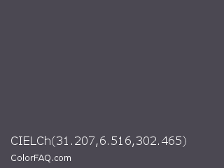 CIELCh 31.207,6.516,302.465 Color is a dark indigo color and the nearest color is Quartz #51484f. Hex code #4b4852 and RGB value is rgb(75,72,82). In RGB color space, this color is composed of 29% red, 28% green, 32% blue, In CMYK color space, this color is composed of 9% cyan, 12% magenta, 0% yellow , 68% black , In HSL color space, this color has a hue angle of 258° , 6% saturation and 30% lightness.