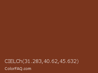 CIELCh 31.283,40.62,45.632 Color is a dark color and the nearest color is Red Robin #80341f. Hex code #7a351d and RGB value is rgb(122,53,29). In RGB color space, this color is composed of 48% red, 21% green, 11% blue, In CMYK color space, this color is composed of 0% cyan, 57% magenta, 76% yellow , 52% black , In HSL color space, this color has a hue angle of 15° , 62% saturation and 30% lightness.