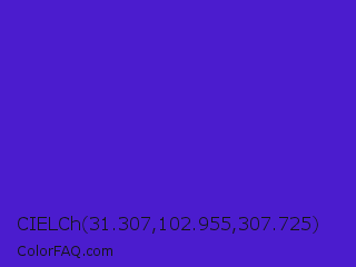 CIELCh 31.307,102.955,307.725 Color is a normal indigo color and the nearest color is Interdimensional Blue #360ccc. Hex code #4b1cce and RGB value is rgb(75,28,206). In RGB color space, this color is composed of 29% red, 11% green, 81% blue, In CMYK color space, this color is composed of 64% cyan, 86% magenta, 0% yellow , 19% black , In HSL color space, this color has a hue angle of 256° , 76% saturation and 46% lightness.