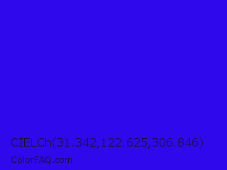 CIELCh 31.342,122.625,306.846 Color is a normal indigo color and the nearest color is Electric Ultramarine #3f00ff. Hex code #2f09eb and RGB value is rgb(47,9,235). In RGB color space, this color is composed of 18% red, 4% green, 92% blue, In CMYK color space, this color is composed of 80% cyan, 96% magenta, 0% yellow , 8% black , In HSL color space, this color has a hue angle of 250° , 93% saturation and 48% lightness.