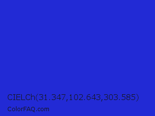 CIELCh 31.347,102.643,303.585 Color is a normal blue color and the nearest color is Palatinate Blue #273be2. Hex code #222ad5 and RGB value is rgb(34,42,213). In RGB color space, this color is composed of 13% red, 16% green, 84% blue, In CMYK color space, this color is composed of 84% cyan, 80% magenta, 0% yellow , 16% black , In HSL color space, this color has a hue angle of 237° , 72% saturation and 48% lightness.