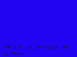 CIELCh 31.446,126.912,306.553 Color is a normal indigo color and the nearest color is Bluebonnet #1c1cf0. Hex code #2105f2 and RGB value is rgb(33,5,242). In RGB color space, this color is composed of 13% red, 2% green, 95% blue, In CMYK color space, this color is composed of 86% cyan, 98% magenta, 0% yellow , 5% black , In HSL color space, this color has a hue angle of 247° , 96% saturation and 48% lightness.
