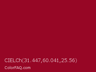 CIELCh 31.447,60.041,25.56 Color is a normal red color and the nearest color is Dark Burgundy Red #900020. Hex code #970625 and RGB value is rgb(151,6,37). In RGB color space, this color is composed of 59% red, 2% green, 15% blue, In CMYK color space, this color is composed of 0% cyan, 96% magenta, 75% yellow , 41% black , In HSL color space, this color has a hue angle of 347° , 92% saturation and 31% lightness.