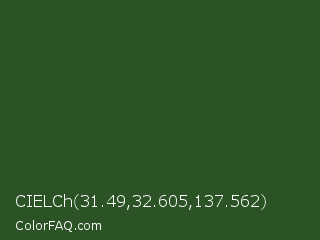 CIELCh 31.49,32.605,137.562 Color is a dark green color and the nearest color is Cal Poly Pomona Green #1e4d2b. Hex code #2c5326 and RGB value is rgb(44,83,38). In RGB color space, this color is composed of 17% red, 33% green, 15% blue, In CMYK color space, this color is composed of 47% cyan, 0% magenta, 54% yellow , 67% black , In HSL color space, this color has a hue angle of 112° , 37% saturation and 24% lightness.