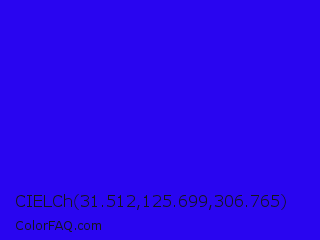 CIELCh 31.512,125.699,306.765 Color is a normal indigo color and the nearest color is Bluebonnet #1c1cf0. Hex code #2905f0 and RGB value is rgb(41,5,240). In RGB color space, this color is composed of 16% red, 2% green, 94% blue, In CMYK color space, this color is composed of 83% cyan, 98% magenta, 0% yellow , 6% black , In HSL color space, this color has a hue angle of 249° , 96% saturation and 48% lightness.