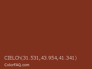 CIELCh 31.531,43.954,41.341 Color is a normal red color and the nearest color is Red Robin #80341f. Hex code #80311e and RGB value is rgb(128,49,30). In RGB color space, this color is composed of 50% red, 19% green, 12% blue, In CMYK color space, this color is composed of 0% cyan, 62% magenta, 77% yellow , 50% black , In HSL color space, this color has a hue angle of 12° , 62% saturation and 31% lightness.