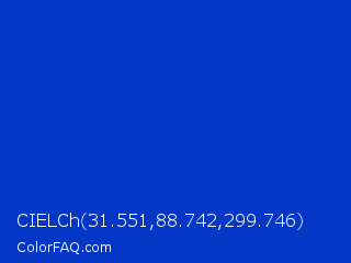 CIELCh 31.551,88.742,299.746 Color is a normal blue color and the nearest color is Absolute Zero #0048ba. Hex code #0537c7 and RGB value is rgb(5,55,199). In RGB color space, this color is composed of 2% red, 22% green, 78% blue, In CMYK color space, this color is composed of 97% cyan, 72% magenta, 0% yellow , 22% black , In HSL color space, this color has a hue angle of 225° , 95% saturation and 40% lightness.