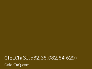 CIELCh 31.582,38.082,84.629 Color is a very dark orange color and the nearest color is Horses Neck #604913. Hex code #5e4707 and RGB value is rgb(94,71,7). In RGB color space, this color is composed of 37% red, 28% green, 3% blue, In CMYK color space, this color is composed of 0% cyan, 24% magenta, 93% yellow , 63% black , In HSL color space, this color has a hue angle of 44° , 86% saturation and 20% lightness.