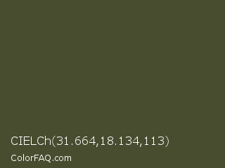 CIELCh 31.664,18.134,113 Color is a dark yellow color and the nearest color is Kelp #454936. Hex code #494d30 and RGB value is rgb(73,77,48). In RGB color space, this color is composed of 29% red, 30% green, 19% blue, In CMYK color space, this color is composed of 5% cyan, 0% magenta, 38% yellow , 70% black , In HSL color space, this color has a hue angle of 68° , 23% saturation and 25% lightness.