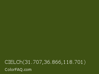 CIELCh 31.707,36.866,118.701 Color is a very dark lime color and the nearest color is Clover #384910. Hex code #3e5113 and RGB value is rgb(62,81,19). In RGB color space, this color is composed of 24% red, 32% green, 7% blue, In CMYK color space, this color is composed of 23% cyan, 0% magenta, 77% yellow , 68% black , In HSL color space, this color has a hue angle of 78° , 62% saturation and 20% lightness.