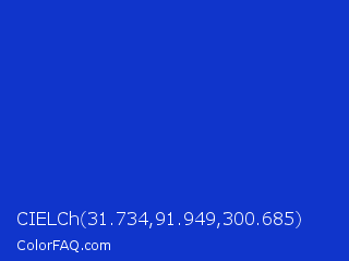 CIELCh 31.734,91.949,300.685 Color is a normal blue color and the nearest color is Persian Blue #1c39bb. Hex code #1035cb and RGB value is rgb(16,53,203). In RGB color space, this color is composed of 6% red, 21% green, 80% blue, In CMYK color space, this color is composed of 92% cyan, 74% magenta, 0% yellow , 20% black , In HSL color space, this color has a hue angle of 228° , 85% saturation and 43% lightness.