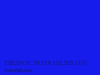 CIELCh 31.78,119.102,305.115 Color is a normal blue color and the nearest color is Bluebonnet #1c1cf0. Hex code #151ceb and RGB value is rgb(21,28,235). In RGB color space, this color is composed of 8% red, 11% green, 92% blue, In CMYK color space, this color is composed of 91% cyan, 88% magenta, 0% yellow , 8% black , In HSL color space, this color has a hue angle of 238° , 84% saturation and 50% lightness.
