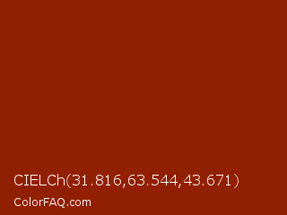 CIELCh 31.816,63.544,43.671 Color is a dark red color and the nearest color is Totem Pole #991b07. Hex code #911f02 and RGB value is rgb(145,31,2). In RGB color space, this color is composed of 57% red, 12% green, 1% blue, In CMYK color space, this color is composed of 0% cyan, 79% magenta, 99% yellow , 43% black , In HSL color space, this color has a hue angle of 12° , 97% saturation and 29% lightness.