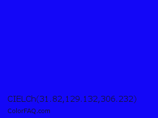 CIELCh 31.82,129.132,306.232 Color is a normal indigo color and the nearest color is Blue #0000ff. Hex code #1307f7 and RGB value is rgb(19,7,247). In RGB color space, this color is composed of 7% red, 3% green, 97% blue, In CMYK color space, this color is composed of 92% cyan, 97% magenta, 0% yellow , 3% black , In HSL color space, this color has a hue angle of 243° , 94% saturation and 50% lightness.