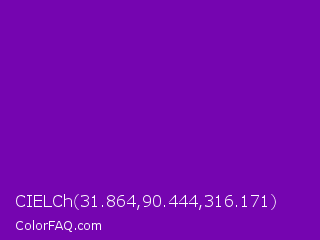 CIELCh 31.864,90.444,316.171 Color is a normal purple color and the nearest color is Violet RYB #8601af. Hex code #7505b0 and RGB value is rgb(117,5,176). In RGB color space, this color is composed of 46% red, 2% green, 69% blue, In CMYK color space, this color is composed of 34% cyan, 97% magenta, 0% yellow , 31% black , In HSL color space, this color has a hue angle of 279° , 94% saturation and 35% lightness.