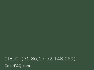 CIELCh 31.86,17.52,148.069 Color is a dark green color and the nearest color is Lunar Green #3c493a. Hex code #37513c and RGB value is rgb(55,81,60). In RGB color space, this color is composed of 22% red, 32% green, 24% blue, In CMYK color space, this color is composed of 32% cyan, 0% magenta, 26% yellow , 68% black , In HSL color space, this color has a hue angle of 132° , 19% saturation and 27% lightness.