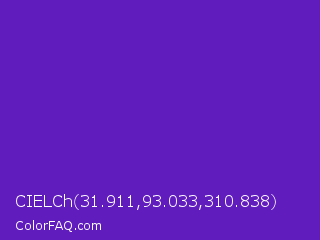 CIELCh 31.911,93.033,310.838 Color is a normal violet color and the nearest color is Purple Heart Crayola #652dc1. Hex code #611cbd and RGB value is rgb(97,28,189). In RGB color space, this color is composed of 38% red, 11% green, 74% blue, In CMYK color space, this color is composed of 49% cyan, 85% magenta, 0% yellow , 26% black , In HSL color space, this color has a hue angle of 266° , 74% saturation and 43% lightness.
