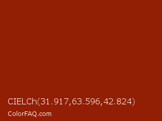CIELCh 31.917,63.596,42.824 Color is a dark red color and the nearest color is Totem Pole #991b07. Hex code #921e04 and RGB value is rgb(146,30,4). In RGB color space, this color is composed of 57% red, 12% green, 2% blue, In CMYK color space, this color is composed of 0% cyan, 79% magenta, 97% yellow , 43% black , In HSL color space, this color has a hue angle of 11° , 95% saturation and 29% lightness.