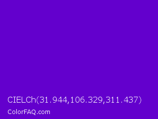 CIELCh 31.944,106.329,311.437 Color is a normal violet color and the nearest color is French Violet #8806ce. Hex code #6300cd and RGB value is rgb(99,0,205). In RGB color space, this color is composed of 39% red, 0% green, 80% blue, In CMYK color space, this color is composed of 52% cyan, 100% magenta, 0% yellow , 20% black , In HSL color space, this color has a hue angle of 269° , 100% saturation and 40% lightness.