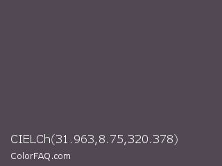 CIELCh 31.963,8.75,320.378 Color is a normal purple color and the nearest color is Quartz #51484f. Hex code #524854 and RGB value is rgb(82,72,84). In RGB color space, this color is composed of 32% red, 28% green, 33% blue, In CMYK color space, this color is composed of 2% cyan, 14% magenta, 0% yellow , 67% black , In HSL color space, this color has a hue angle of 290° , 8% saturation and 31% lightness.