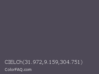 CIELCh 31.972,9.159,304.751 Color is a normal violet color and the nearest color is Abbey #4c4f56. Hex code #4e4957 and RGB value is rgb(78,73,87). In RGB color space, this color is composed of 31% red, 29% green, 34% blue, In CMYK color space, this color is composed of 10% cyan, 16% magenta, 0% yellow , 66% black , In HSL color space, this color has a hue angle of 261° , 9% saturation and 31% lightness.