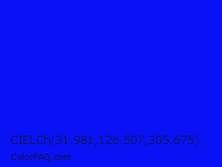 CIELCh 31.981,126.507,305.675 Color is a normal blue color and the nearest color is Blue #0000ff. Hex code #0812f5 and RGB value is rgb(8,18,245). In RGB color space, this color is composed of 3% red, 7% green, 96% blue, In CMYK color space, this color is composed of 97% cyan, 93% magenta, 0% yellow , 4% black , In HSL color space, this color has a hue angle of 237° , 94% saturation and 50% lightness.