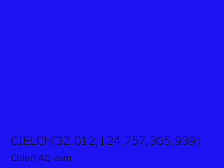 CIELCh 32.012,124.757,305.939 Color is a normal indigo color and the nearest color is Bluebonnet #1c1cf0. Hex code #1c12f2 and RGB value is rgb(28,18,242). In RGB color space, this color is composed of 11% red, 7% green, 95% blue, In CMYK color space, this color is composed of 88% cyan, 93% magenta, 0% yellow , 5% black , In HSL color space, this color has a hue angle of 243° , 90% saturation and 51% lightness.