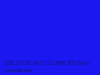 CIELCh 32.087,122.689,305.606 Color is a normal indigo color and the nearest color is Bluebonnet #1c1cf0. Hex code #1a17f0 and RGB value is rgb(26,23,240). In RGB color space, this color is composed of 10% red, 9% green, 94% blue, In CMYK color space, this color is composed of 89% cyan, 90% magenta, 0% yellow , 6% black , In HSL color space, this color has a hue angle of 241° , 88% saturation and 52% lightness.