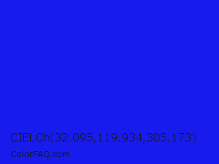 CIELCh 32.095,119.934,305.173 Color is a normal blue color and the nearest color is Bluebonnet #1c1cf0. Hex code #171ced and RGB value is rgb(23,28,237). In RGB color space, this color is composed of 9% red, 11% green, 93% blue, In CMYK color space, this color is composed of 90% cyan, 88% magenta, 0% yellow , 7% black , In HSL color space, this color has a hue angle of 239° , 86% saturation and 51% lightness.