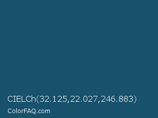 CIELCh 32.125,22.027,246.883 Color is a dark blue color and the nearest color is Chathams Blue #175579. Hex code #18516b and RGB value is rgb(24,81,107). In RGB color space, this color is composed of 9% red, 32% green, 42% blue, In CMYK color space, this color is composed of 78% cyan, 24% magenta, 0% yellow , 58% black , In HSL color space, this color has a hue angle of 199° , 63% saturation and 26% lightness.
