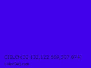 CIELCh 32.132,122.609,307.874 Color is a normal indigo color and the nearest color is Electric Ultramarine #3f00ff. Hex code #4101eb and RGB value is rgb(65,1,235). In RGB color space, this color is composed of 25% red, 0% green, 92% blue, In CMYK color space, this color is composed of 72% cyan, 100% magenta, 0% yellow , 8% black , In HSL color space, this color has a hue angle of 256° , 99% saturation and 46% lightness.