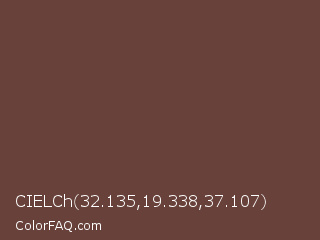 CIELCh 32.135,19.338,37.107 Color is a normal red color and the nearest color is Roast Coffee #704241. Hex code #68423a and RGB value is rgb(104,66,58). In RGB color space, this color is composed of 41% red, 26% green, 23% blue, In CMYK color space, this color is composed of 0% cyan, 37% magenta, 44% yellow , 59% black , In HSL color space, this color has a hue angle of 10° , 28% saturation and 32% lightness.