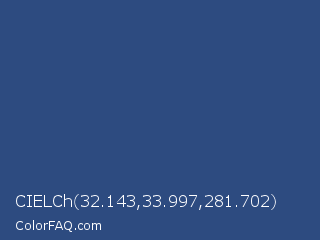 CIELCh 32.143,33.997,281.702 Color is a normal blue color and the nearest color is Chambray #354e8c. Hex code #2d4b80 and RGB value is rgb(45,75,128). In RGB color space, this color is composed of 18% red, 29% green, 50% blue, In CMYK color space, this color is composed of 65% cyan, 41% magenta, 0% yellow , 50% black , In HSL color space, this color has a hue angle of 218° , 48% saturation and 34% lightness.