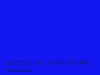 CIELCh 32.151,123.768,305.483 Color is a normal blue color and the nearest color is Bluebonnet #1c1cf0. Hex code #1217f2 and RGB value is rgb(18,23,242). In RGB color space, this color is composed of 7% red, 9% green, 95% blue, In CMYK color space, this color is composed of 93% cyan, 90% magenta, 0% yellow , 5% black , In HSL color space, this color has a hue angle of 239° , 90% saturation and 51% lightness.