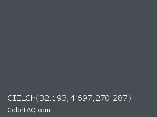 CIELCh 32.193,4.697,270.287 Color is a dark blue color and the nearest color is Mako #444954. Hex code #484c53 and RGB value is rgb(72,76,83). In RGB color space, this color is composed of 28% red, 30% green, 33% blue, In CMYK color space, this color is composed of 13% cyan, 8% magenta, 0% yellow , 67% black , In HSL color space, this color has a hue angle of 218° , 7% saturation and 30% lightness.