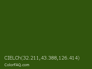 CIELCh 32.211,43.388,126.414 Color is a very dark green color and the nearest color is Green House #24500f. Hex code #31550d and RGB value is rgb(49,85,13). In RGB color space, this color is composed of 19% red, 33% green, 5% blue, In CMYK color space, this color is composed of 42% cyan, 0% magenta, 85% yellow , 67% black , In HSL color space, this color has a hue angle of 90° , 73% saturation and 19% lightness.
