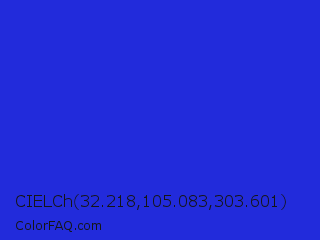 CIELCh 32.218,105.083,303.601 Color is a normal blue color and the nearest color is Palatinate Blue #273be2. Hex code #222bdb and RGB value is rgb(34,43,219). In RGB color space, this color is composed of 13% red, 17% green, 86% blue, In CMYK color space, this color is composed of 84% cyan, 80% magenta, 0% yellow , 14% black , In HSL color space, this color has a hue angle of 237° , 73% saturation and 50% lightness.