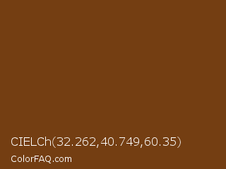 CIELCh 32.262,40.749,60.35 Color is a dark orange color and the nearest color is Sepia #704214. Hex code #743e12 and RGB value is rgb(116,62,18). In RGB color space, this color is composed of 45% red, 24% green, 7% blue, In CMYK color space, this color is composed of 0% cyan, 47% magenta, 84% yellow , 55% black , In HSL color space, this color has a hue angle of 27° , 73% saturation and 26% lightness.