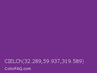 CIELCh 32.289,59.937,319.589 Color is a normal purple color and the nearest color is Eminence #6c3082. Hex code #722c8a and RGB value is rgb(114,44,138). In RGB color space, this color is composed of 45% red, 17% green, 54% blue, In CMYK color space, this color is composed of 17% cyan, 68% magenta, 0% yellow , 46% black , In HSL color space, this color has a hue angle of 285° , 52% saturation and 36% lightness.