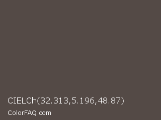 CIELCh 32.313,5.196,48.87 Color is a dark orange color and the nearest color is Emperor #514649. Hex code #544a46 and RGB value is rgb(84,74,70). In RGB color space, this color is composed of 33% red, 29% green, 27% blue, In CMYK color space, this color is composed of 0% cyan, 12% magenta, 17% yellow , 67% black , In HSL color space, this color has a hue angle of 17° , 9% saturation and 30% lightness.