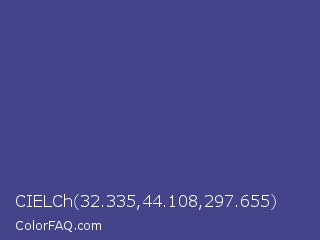 CIELCh 32.335,44.108,297.655 Color is a normal indigo color and the nearest color is Dark Slate Blue #483d8b. Hex code #45448a and RGB value is rgb(69,68,138). In RGB color space, this color is composed of 27% red, 27% green, 54% blue, In CMYK color space, this color is composed of 50% cyan, 51% magenta, 0% yellow , 46% black , In HSL color space, this color has a hue angle of 241° , 34% saturation and 40% lightness.