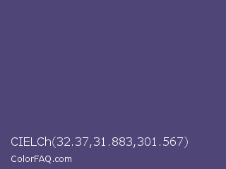 CIELCh 32.37,31.883,301.567 Color is a normal indigo color and the nearest color is Cyber Grape #58427c. Hex code #4f4577 and RGB value is rgb(79,69,119). In RGB color space, this color is composed of 31% red, 27% green, 47% blue, In CMYK color space, this color is composed of 34% cyan, 42% magenta, 0% yellow , 53% black , In HSL color space, this color has a hue angle of 252° , 27% saturation and 37% lightness.