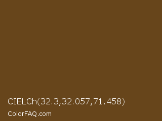 CIELCh 32.3,32.057,71.458 Color is a dark orange color and the nearest color is Pullman Brown UPS Brown #644117. Hex code #67451b and RGB value is rgb(103,69,27). In RGB color space, this color is composed of 40% red, 27% green, 11% blue, In CMYK color space, this color is composed of 0% cyan, 33% magenta, 74% yellow , 60% black , In HSL color space, this color has a hue angle of 33° , 58% saturation and 25% lightness.