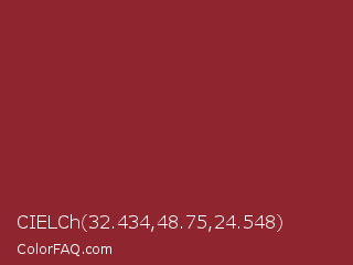 CIELCh 32.434,48.75,24.548 Color is a normal red color and the nearest color is Vivid Auburn #922724. Hex code #8e252f and RGB value is rgb(142,37,47). In RGB color space, this color is composed of 56% red, 15% green, 18% blue, In CMYK color space, this color is composed of 0% cyan, 74% magenta, 67% yellow , 44% black , In HSL color space, this color has a hue angle of 354° , 59% saturation and 35% lightness.